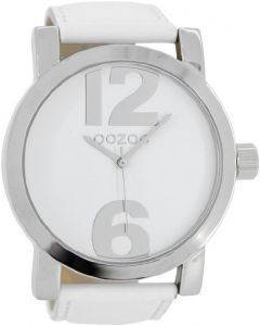 'Ενα ρολόι απο την OOZOO από μεταλλικό πλαίσιο, ασημί καντράν με ασημί φωσφορίζοντες δείκτες και σημεία και λευκό δερμάτινο λουράκι..