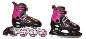 Αυξομειούμενα παιδικά πατίνια διπλής εφαρμογής, 4 μεγεθών με τροχούς σε ευθεία (inlane skates) και με λεπίδα για χρήση στον πάγο από την Αθλοπαιδιά. Τα πατίνια διατίθενται σε τσάντα με φερμουάρ.