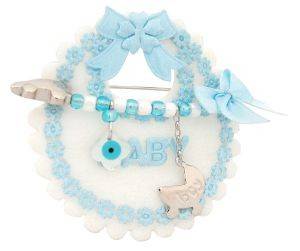 Πανέμορφο φυλακτό για αγοράκι σε σχεδιο σαλιάρα με ασημένια καρφίτσα διακοσμημένη με ημιπολύτιμους λίθους, ματάκι και ασημένια μοτίφ. Ιδανικό να το κρεμάσετε στο καροτσάκι ή στο κρεβατάκι του.