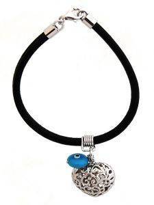 Φανταστικό δερμάτινο βραχιόλι σε μαύρο χρώμα με charms τρισδιάστατη καρδούλα με περίτεχνο σχέδιο από ασήμι 925 και ματάκι.