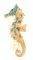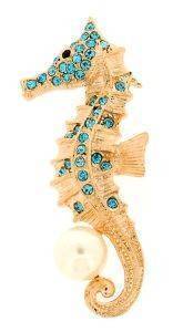 Καρφίτσα ιππόκαμπος Alexi Andriotti σε χρυσό χρώμα, διακοσμημένη με τιρκουαζ κρύσταλλα και μαργαριτάρι.