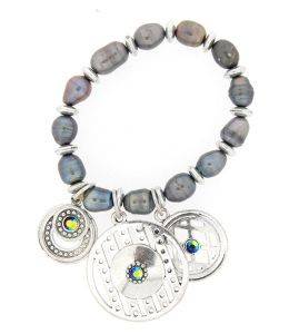 Μοντέρνο βραχιόλι με γκρι πετράδια και μεταλλικά στοιχεία διακοσμημένα με στρας.