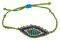 Χειροποίητο πλεκτό βραχιόλι με μοτίφ μάτι, σε λαδί χρώμα με χρυσές, μωβ και μπλε λεπτομέρειες.