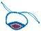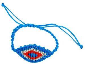 Χειροποίητο πλεκτό βραχιόλι με μοτίφ μάτι, σε τυρκουάζ χρώμα με ασημί και κόκκινες λεπτομέρειες.