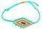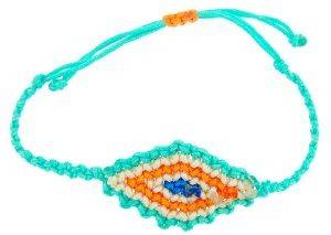 Χειροποίητο πλεκτό βραχιόλι με μοτίφ μάτι, σε πράσινο ανοιχτό χρώμα με πορτοκαλί, μπεζ και μπλε λεπτομέρειες.