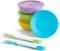 Διατίθενται ταιριαστά μπολ και ποτήρια ξεχωριστά: Σετ 4 πιάτα σε κίτρινο πράσινο, μπλε και μωβ χρώμα για παιδιά που μπαίνουν το ένα μέσα στο άλλο
