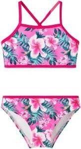 Bikini set από την εταιρεία Name it.Με φορετό bikini top διακοσμημένο με ραντάκια, που καταλήγουν σε χιαστί σχέδιο στην πλάτη. Bikini brief με μαλακό λάστιχο στη μέση. Είναι διακοσμημένο σε όλη του την επιφάνεια και στα δύο μέρη με μοτίβο όπου απεικονίζονται εξωτικά λουλούδια και φοίνικες.